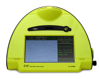 The EVE™ uses state-of-the-art optics and image analysis to automate cell counting. It is a benchtop counter, designed to measure cell count and viability (live, dead, and total cells) accurately and precisely, using the standard trypan blue technique.