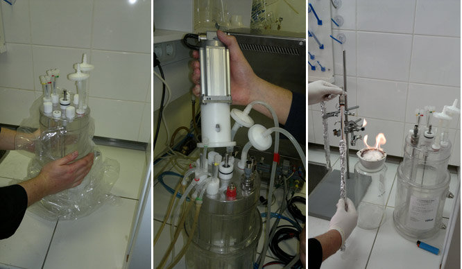 To ensure fully automated in-situ sterilization process, it is necessary to install pneumatically controlled membrane valves in the bottom, the inlet of a sparger and the lid of the vessel.