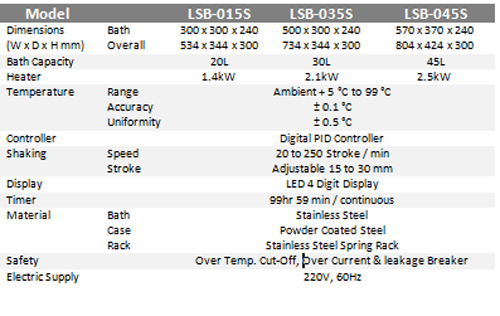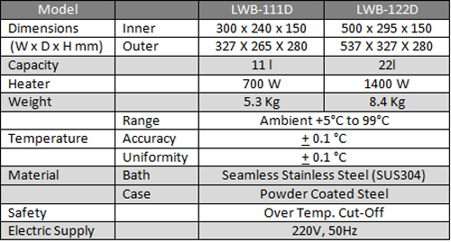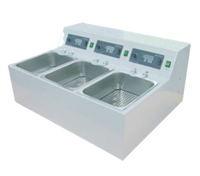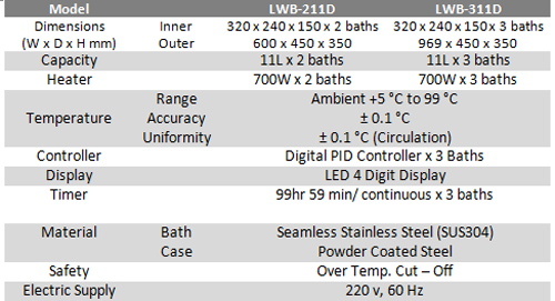 Three Chambers have independent Controls for Operating at Different Temperatures Microprocessor PID Control for 0.1 °C Accuracy Timer, Alarm, Auto-Tunning Function Precise Temperature Control up to 99 °C Built-in Safety and Convenience Two Models with Bath Capacities 11 l Seamless Stainless Steel Bath (SUS304)